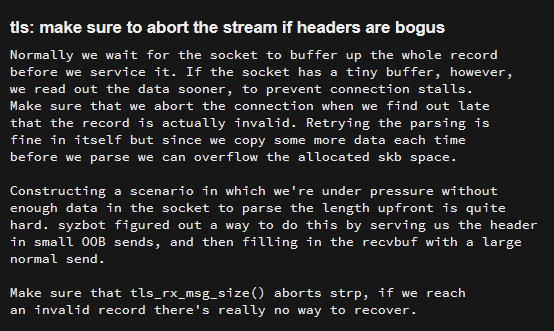 So this was a vulnerability in the kernel TLS subsystem (found under net/tls). Based on the commit description, we can assume it has something to do with parsing invalid TLS headers, and that it likely leads to an out-of-bounds access on an allocated SKB.