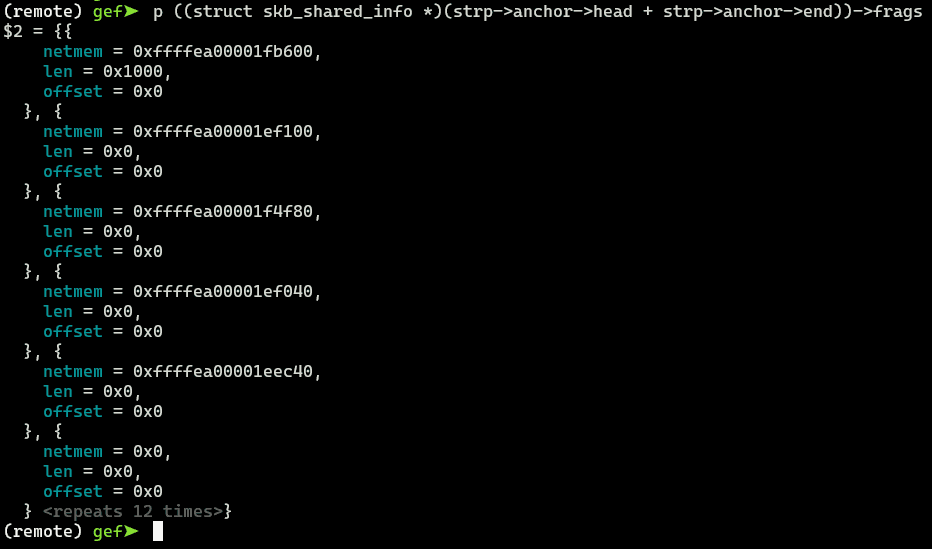 strp->anchorto be allocated, and the shared info structure should allocate on top of one of the previously sprayed SKB's shared info structures. This means that thefragsarray will contain a stale pointer in the 6th fragment. - Spray a bunch of pagetables, presumably by calling