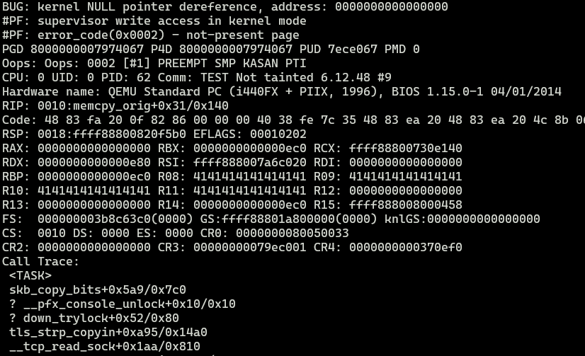 Going back to my PoC, I trigger tls_sw_recvmsg() in a loop so that we can trigger tls_strp_copyin_frag() over and over again, triggering the vulnerability. With my PoC, on the 8th call to tls_strp_copyin_frag(), it triggers a NULL pointer dereference.