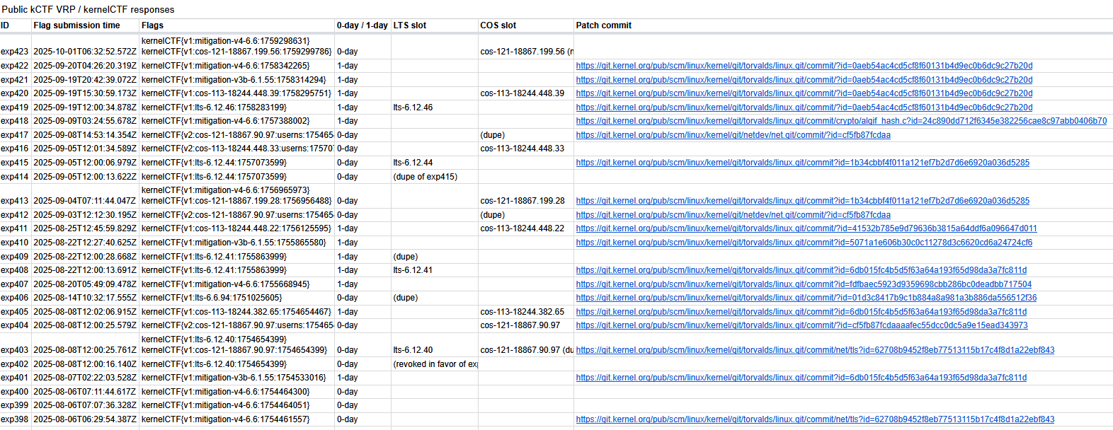 Fortunately for me, Google's kernelCTF makes it really easy to find examples of patched vulnerabilities. The public kCTF spreadsheet contains every kCTF submission, including patch commits when they're available: